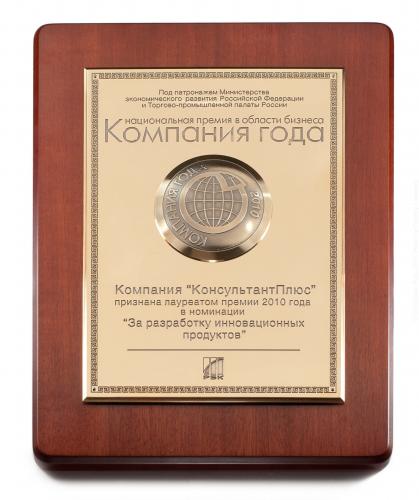 7 декабря 2010 г. в Москве состоялась торжественная церемония награждения лауреатов национальной премии "Компания года". "Консультант Плюс" получила награду в номинации "За разработку инновационных продуктов". Эта премия - независимое подтверждение лидерства "КонсультантПлюс" в создании полезных и инновационных продуктов, в умении вовремя и точно отвечать на потребности рынка.